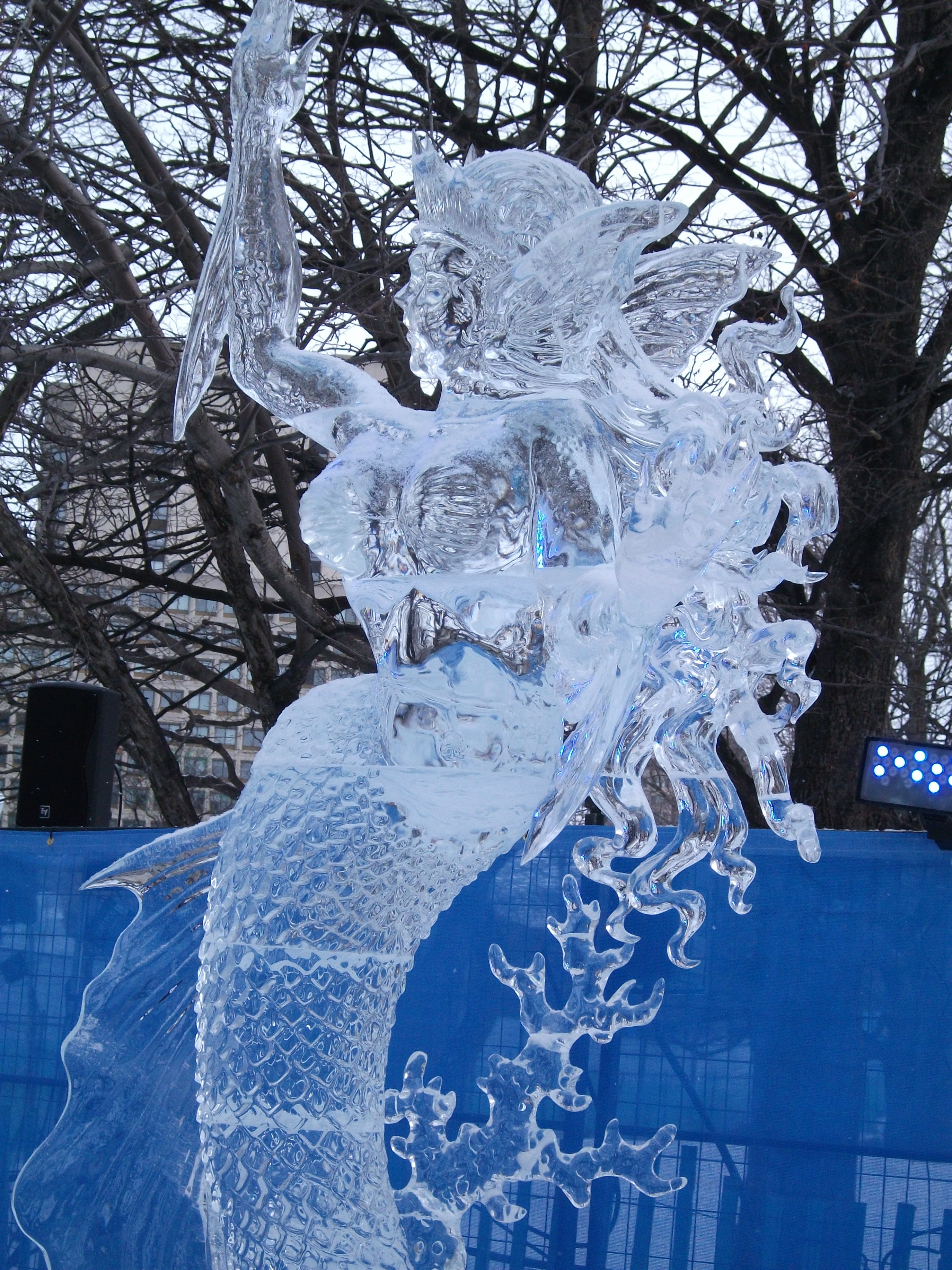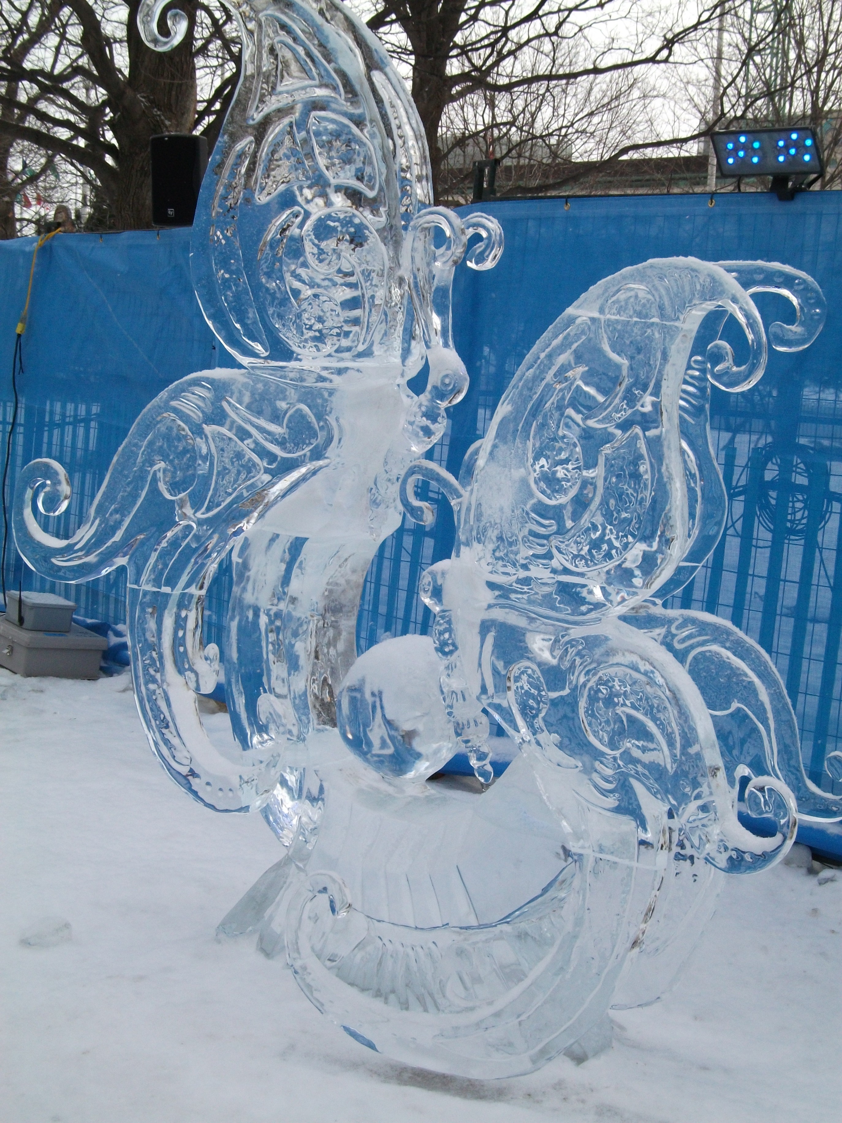 The festival involved differing parts of the city exhibiting or holding events to do with winter. Basically a bit like the Edinburgh Festival but more to do with snow and ice. At Confederation Park there were hundreds of ice-sculptures, ranging from the very small to over 20ft high; from dragons, fairies, ships, animals, houses. Each were so ornate they looked like, they were made from glass or plastic.