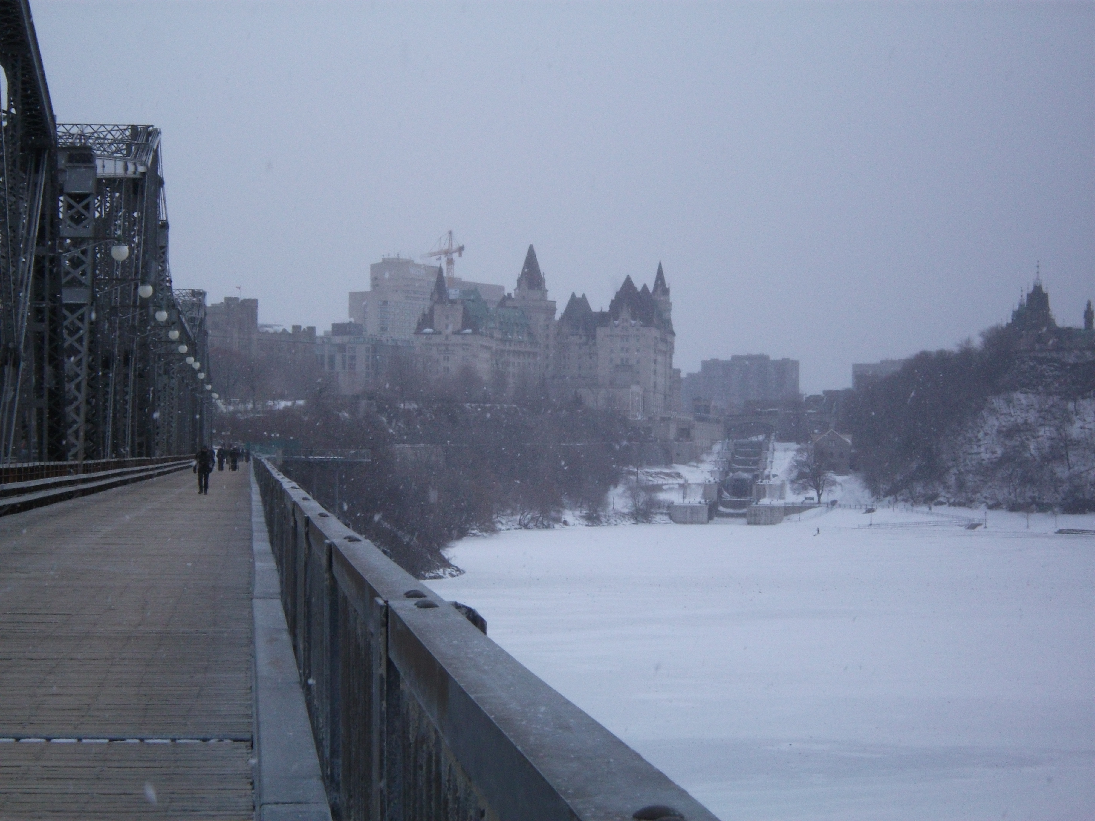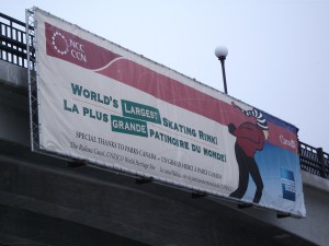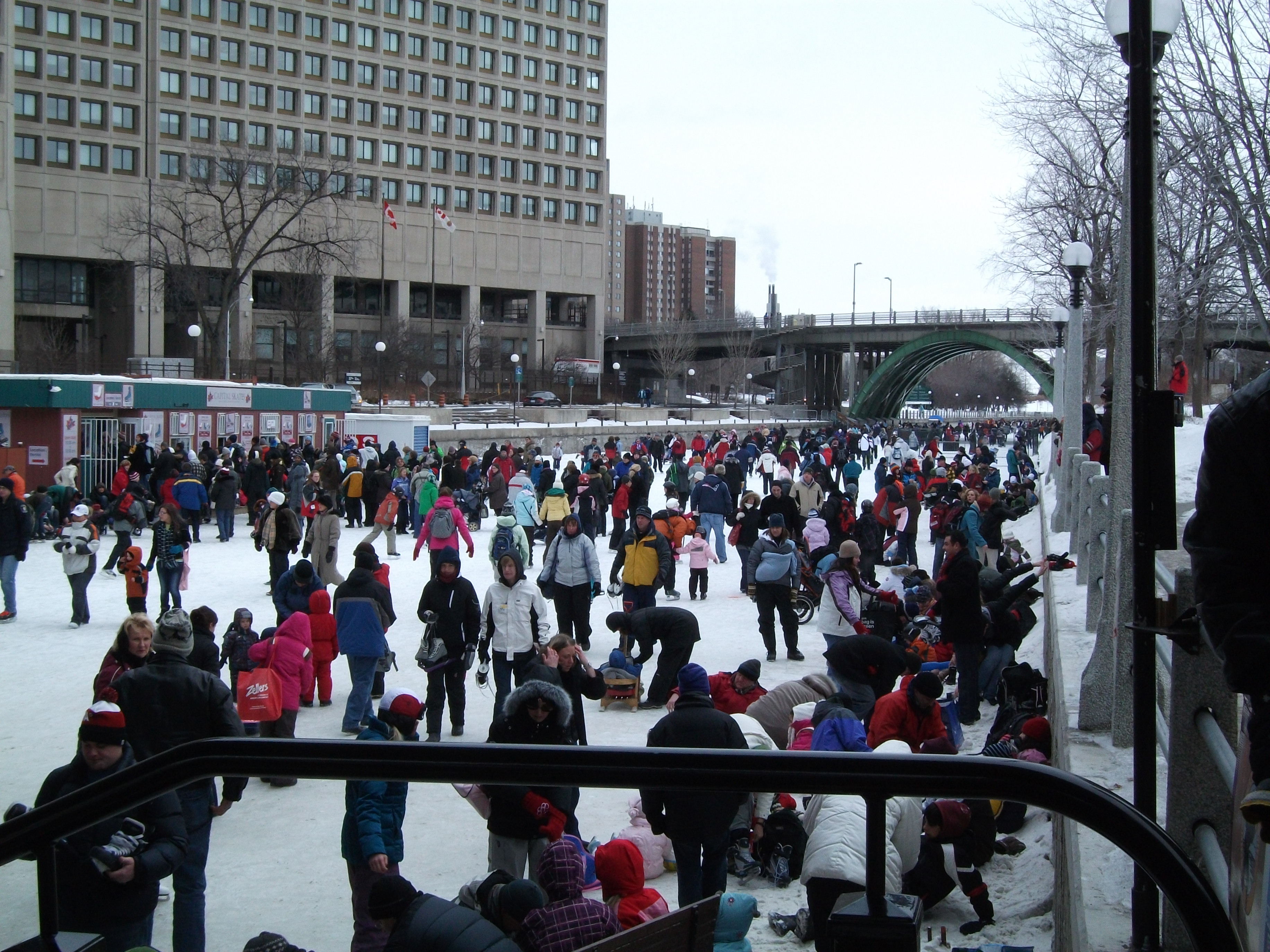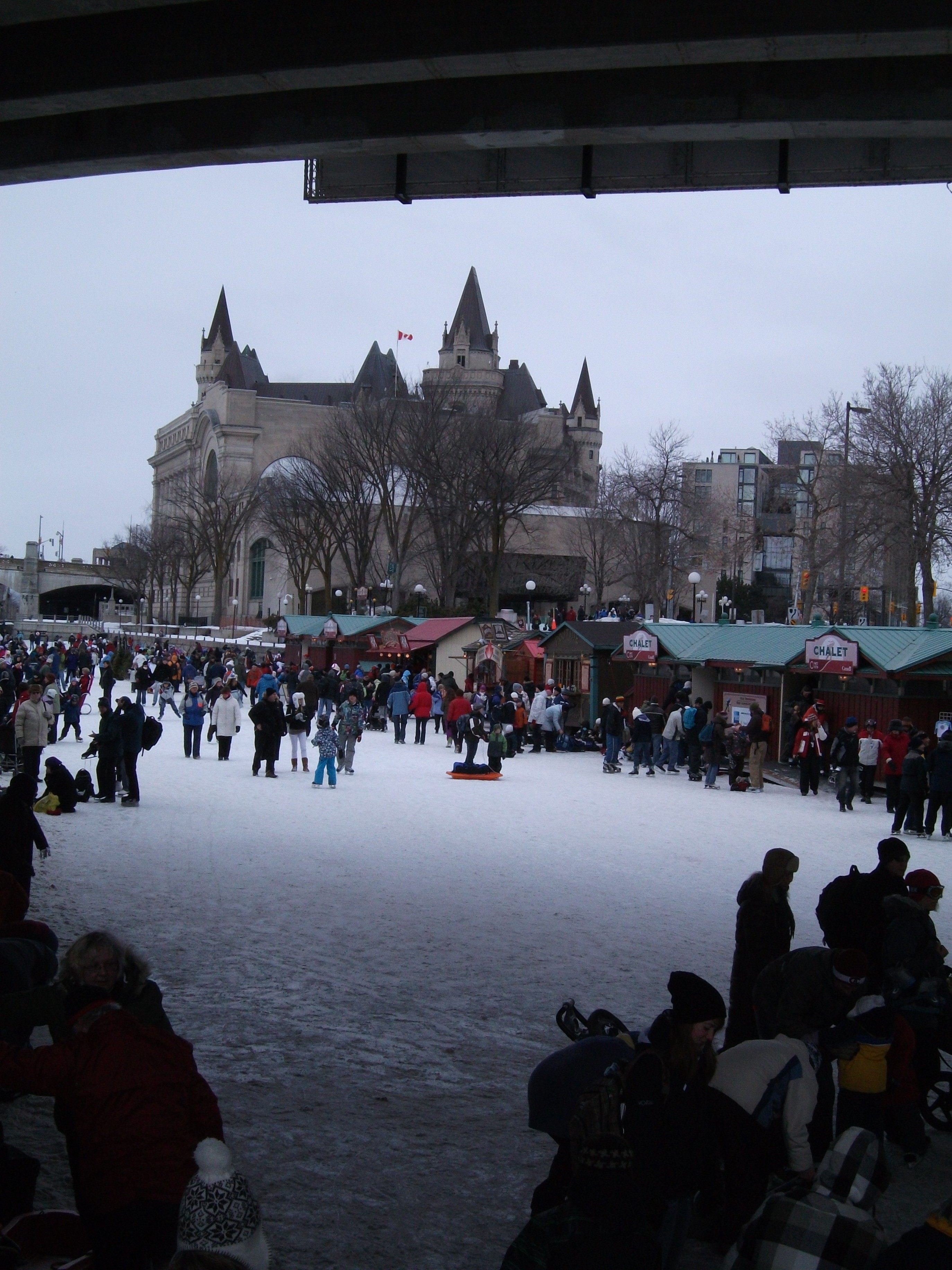 . . . . The frozen Rideau Canal, which in the summer runs through the centre of Ottawa. The ice-rink is 7.5km in length and you can either skate or walk along its frozen-ness! I decided to walk, images of a broken leg while on exchange haunted me – plus I’m a skater who needs a bar to hold onto for dear life.