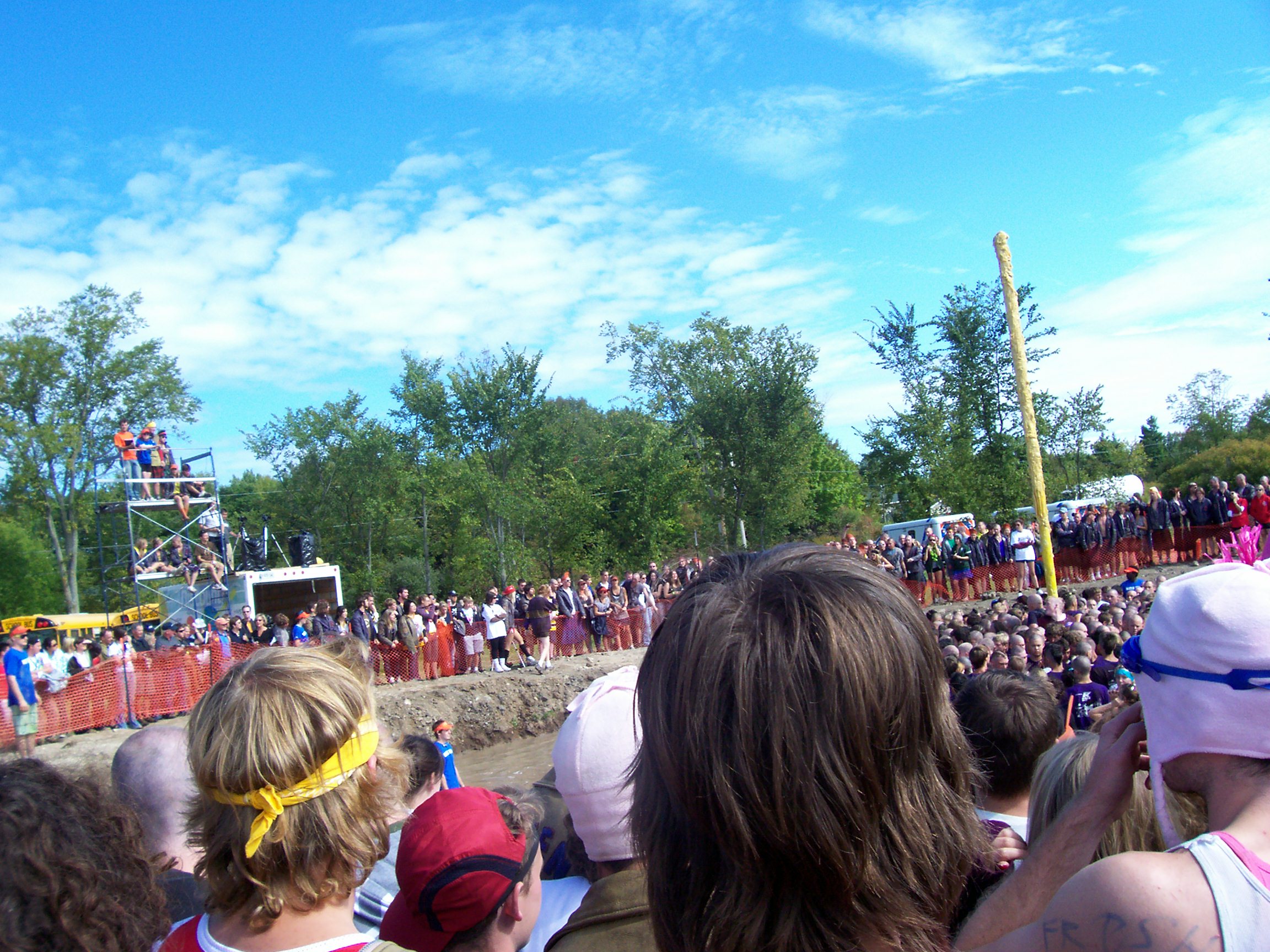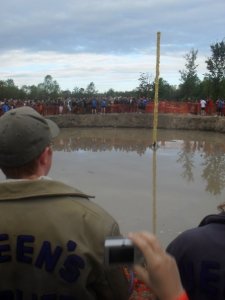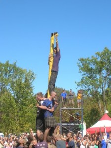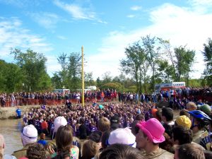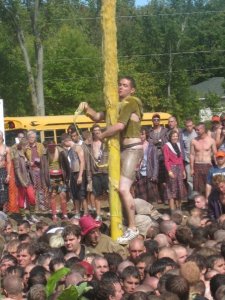 Climbing the pole – Imagine climbing the Pole, if you can. You’re up there on the 3rd level of the human pyramid. Bit by bit you stretch up, reaching for the tam and with a huge stretch and an intake of breath you are just about to grasp hold of it. Yes, you think, this will be it, the tam is coming off! Then an unripe apple, whizzing in at 30 mph, slams you on the head and you fall, plunging 20+ feet onto your classmates below. Imagine a metal pole 30 feet tall, well greased with axle grease, and with a tam nailed securely to the top and you have a pretty daunting challenge. Add projectiles from every direction, disgusting things floating in the mess on which you are standing, and a high potential for bruises, broken bones, cuts and scrapes that don’t heal all in the name of a test of teamwork and bonding!