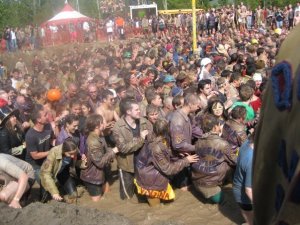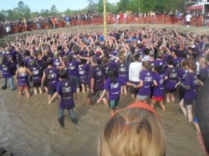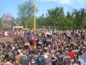 Upper Years arrive and chaos reaches the scene. Rowdy, purple, hyper and mostly drunk, the Upper Years work themselves into a frenzy while waiting for the Frosh who are travelling “the long route” to the site in buses that have the heating blasting and windows covered. The Frosh have their heads shaved and must lie on the floor of the coach with their heads covered. The FRECs take up position around the fence. Finally, the Frosh buses arrive and with a roar(and I mean a roar, enough to chill your blood) from the crowd, the Frosh are welcomed into the freezing water of the Pit, suitably shocking after their warm ride. Disorientated, tired, shivering, hungover, with their eyes adjusting to the light, the Frosh are jeered at and descend into the chaos. Music blasting the Frosh bewilderingly begin. Soon they find unlike axle grease, lanolin is very difficult to climb and being lame, they cannot get the tam by themselves. At one hour in, the 4th years are invited into the Pit. With a scream, they enter and after a bit of chaos and fun, begin to help the Frosh, well seasoned at the event. Fifteen minutes later, the 3rd years go in and fifteen minutes after that, the FRECs launch in. The air seems to crackle as new energy is found. The Pit is almost full with bodies, giving adequate mass with which to support the upper levels. Together, all engineers working toward one goal perhaps for the only time in their time at Queen’s, the tam is ripped off. Everyone is excited for the Frosh, everyone laughs and yells and chants and moshes. The Frosh started by working together, but can only accomplish their task by joining forces with their older students.