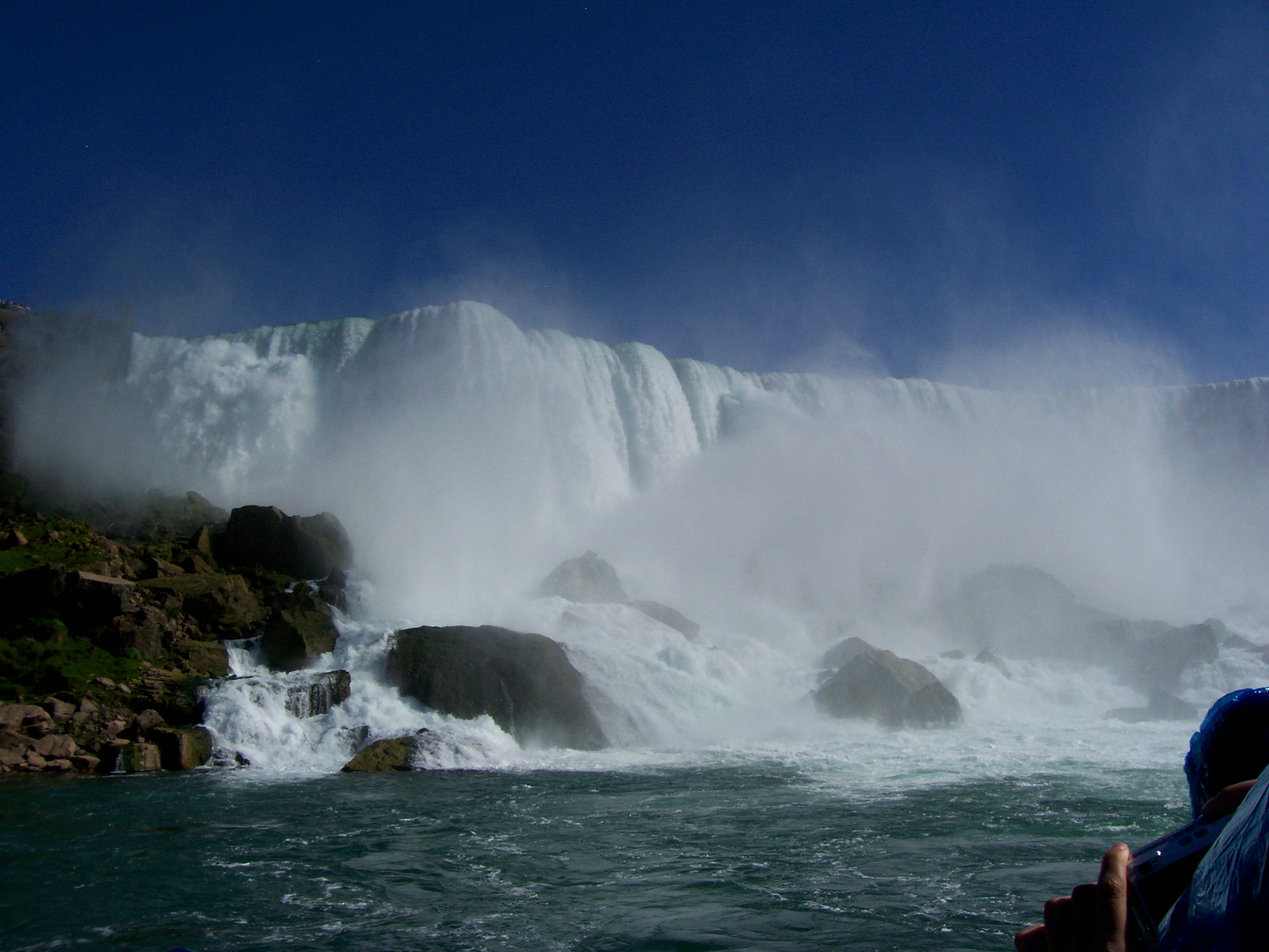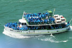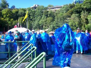 A group of us went on the “Maid of the Mist”, a boat ride that gives you a close-up and very wet experience of the Falls. You get to go right to the base of the Falls and fully appreciate their force and roar. Before getting on the boat we were given a blue, transparent mac, but I never expected to get anywhere near as wet as I did. For part of the trip it was like standing in the shower with your clothes on, completely absurd but then you also couldn’t see anything apart from spray and mist when we got close to the Falls. People squealed like mad, was very funny. The boat trip was the highight of the day and a must if you ever get the chance to go to Niagra.