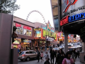 After viewing the Falls, taking in the sites and walking round the parkland that borders the Falls, we headed back into the city for the evening and found our way to a casino. I’ve lived a sheltered life, so I’d never stepped foot in a casino before and with trepidation entered what I assumed would be a luxurious palace of vice, sin, money, wealthy- well dressed people wearing ball-gowns (I’ve been watching too much James Bond, I think). The reality was somewhat different – lovely patterned carpet like your gran would have, actually, on second-thoughts, my gran wouldn’t’; it was too florally and patterned. Garish lighting, with row after row after row after row of slot machines, what?! And who was sitting at them – handsome well-dressed people, nope very everyday looking Mr and Mrs Canada and surprisingly very few younger people in sight. Through the labyrinth of man-mad money-taking machines we made our way out to the other side and faced the sea of what I think were blackjack tables and other card games. Again, all my illusions were shattered. But I hear you cry, ‘did you have a go then?’, ‘How much did you win?’ Well, my friends (or I mean, my one Canadian-Polish reader, you know who you are!) I was meek and mild along with all my exchange companions, call us skin-flints but we firmly kept our money in our pockets, we had better ideas of putting the loonies towards a cheap burger from the neon city! So there, ended my soiree into the world of what I expected to be Casino-Royale but actually turned out to be Mecca Bingo. Ahhh, the reckless, high life of a student.