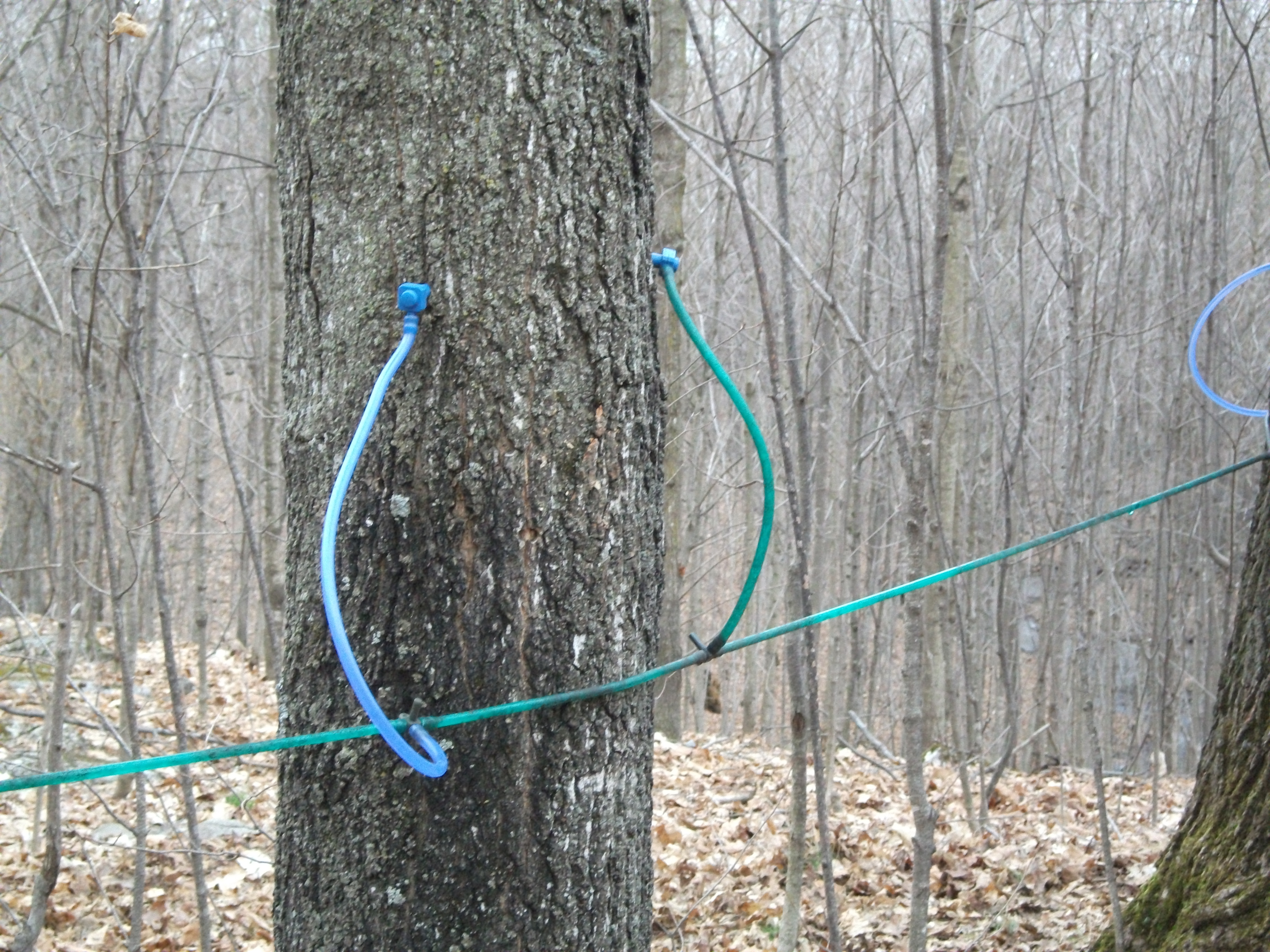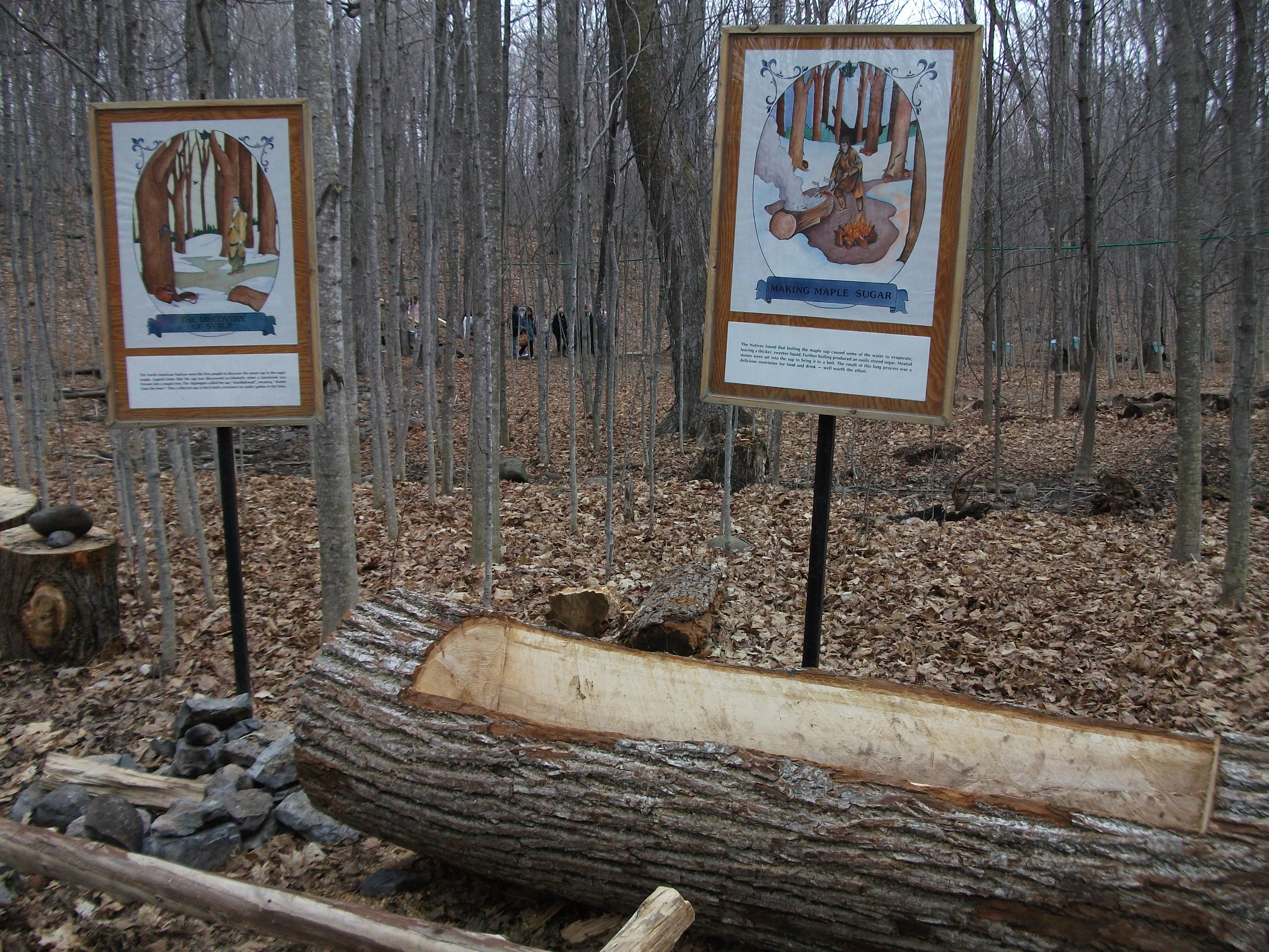 When we fell off the cart (I’m only joking) we realised it must be time to begin walking and so commenced our walking tour of the maple bush, trekking our way throught the maple woodland. We were able to see how maple sap was previously collected in comparison to the new modern methods. Previously, a hole would be made in the trunk of a maple tree and a bucket would be placed underneath to catch the dripping sap. Now, a tube is inserted into the trunk and the trees are connected by a series of plastic pipes and tubes which run to a large vat.