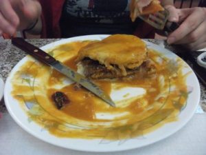 Talking about food, there is a famous dish with Porto origins called francesinha. Basically, it consists of several slices of meat (steak, sausage, ham) between two slices of bread, all of it covered with melted cheese and served with tomato sauce and chips. It does not seem to be a sophisticated dish, however, it is deliciouuus! The photo of francesinha we ate: