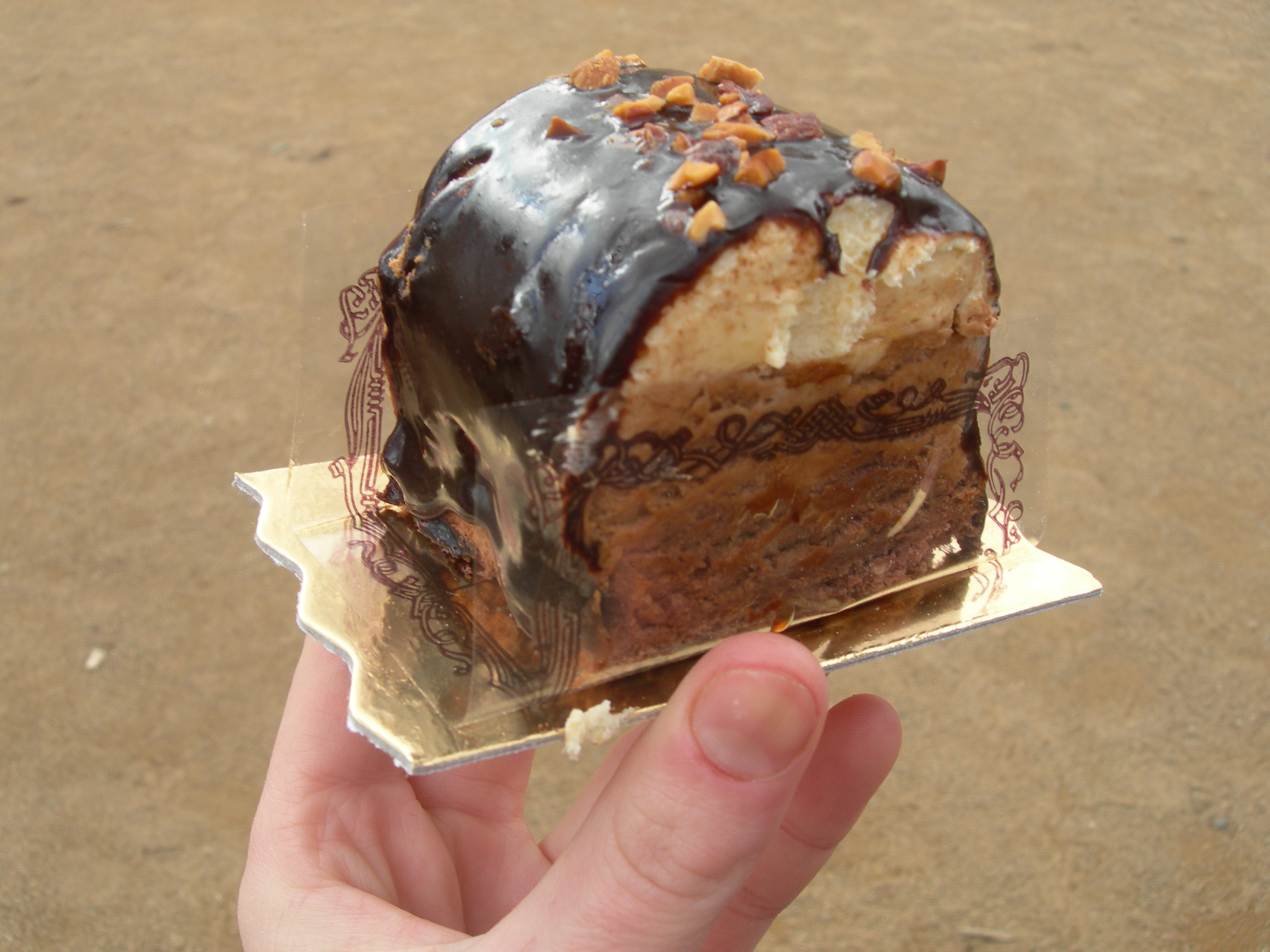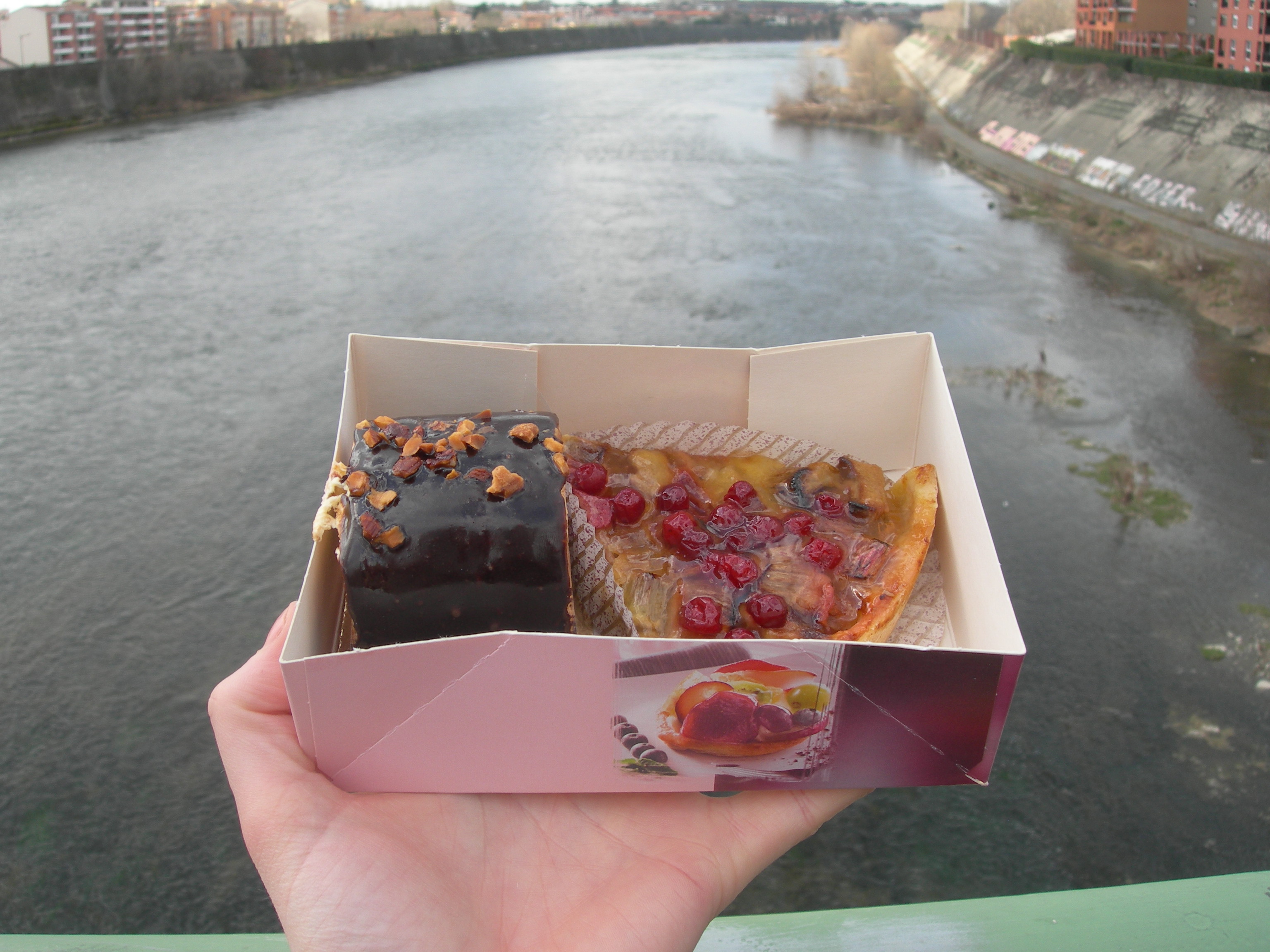 The next day we went to my local patisserie. This is probably the best patisserie in Toulouse (that I have been to, and I have been to many patisseries). We bought a slice of rhubarb tart and a chocolate thing. A three chocolate thing. We took some pictures of them as we walked across the Garonne. Here is the proof