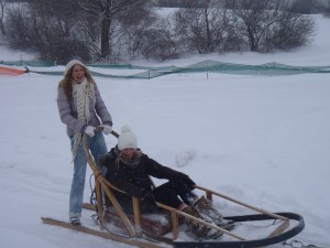 (Below: Julia taking the reins on our very first dog sledding adventure!)