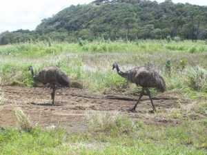 Emus -right on the side of the road, not a care in the world.