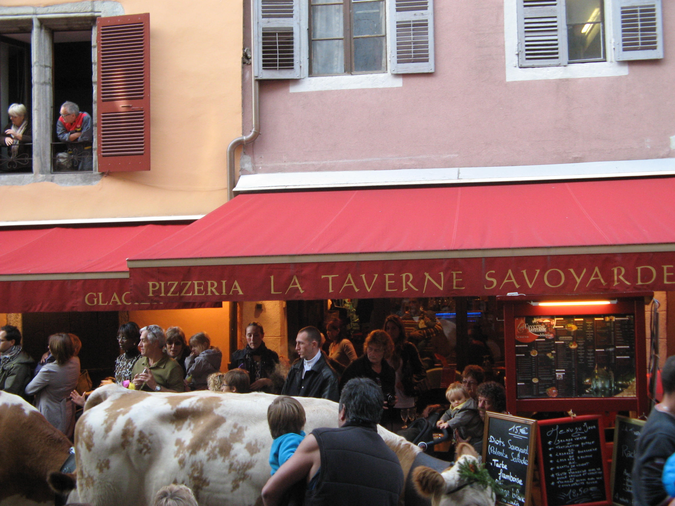 Conversely, the coming of winter is celebrated in the Alps. This Saturday I went on a trip to Annecy, the ‘Venice’ of France where Rousseau once lived with his slightly doubtful ‘Maman’, but today the scene of the ‘Retour des Alpages.’ Traditionally, this is the time when all the livestock are brought back down from the mountains for winter. The lanes of the old town were full of market stalls selling potato stew, chestnuts and apple juice, through which was later squeezed an entire procession of animals: cows, sheep, goats and donkeys. The cows created the greatest stir, occasioning great laughter from the tightly packed crowd. When asked what was going on, a Frenchman turned to me and said that evocative, recurrent word ‘les bouses.’