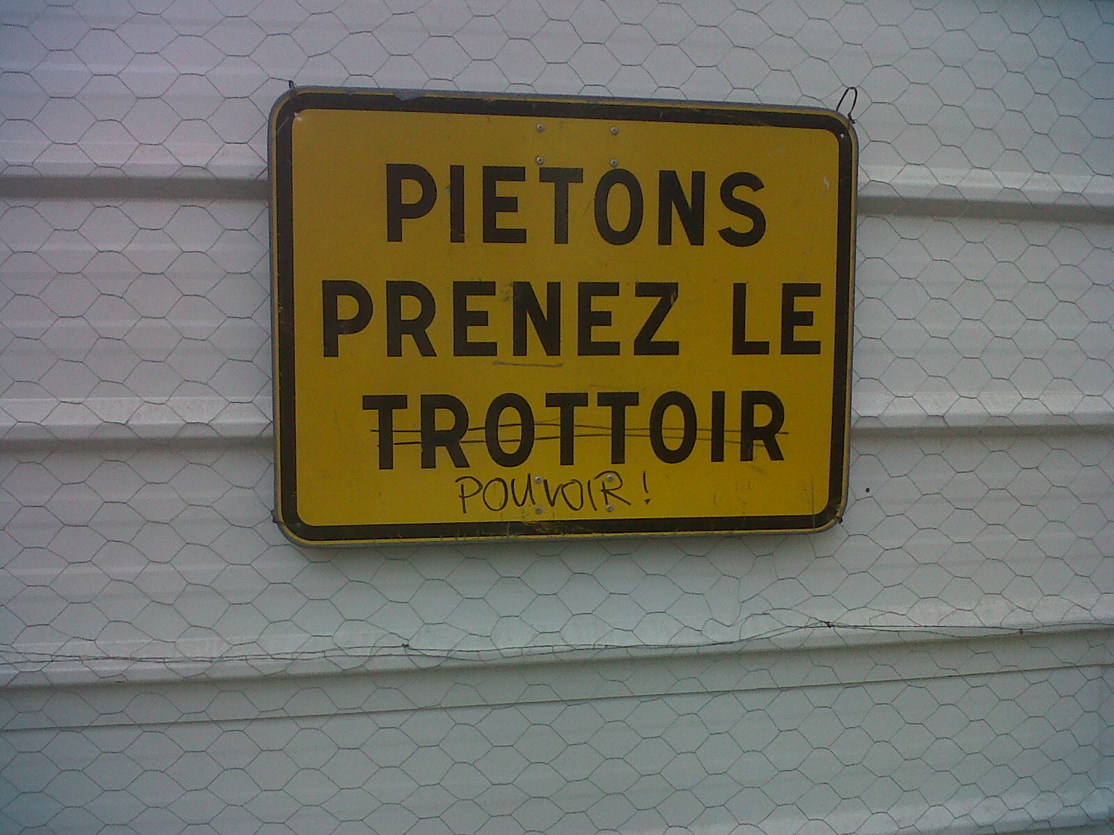 Amusing graffiti – the translation reads “pedestrians, take the pavement”, with the last word crossed out and replaced by “power!”
