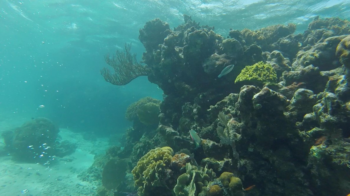 Marine researches took place on island Utila, which is an hour’s ferry ride from the mainland. The coral reefs are key habitats for fish and invertebrates. Can you spot a stoplight parrotfish swimming among the corals?