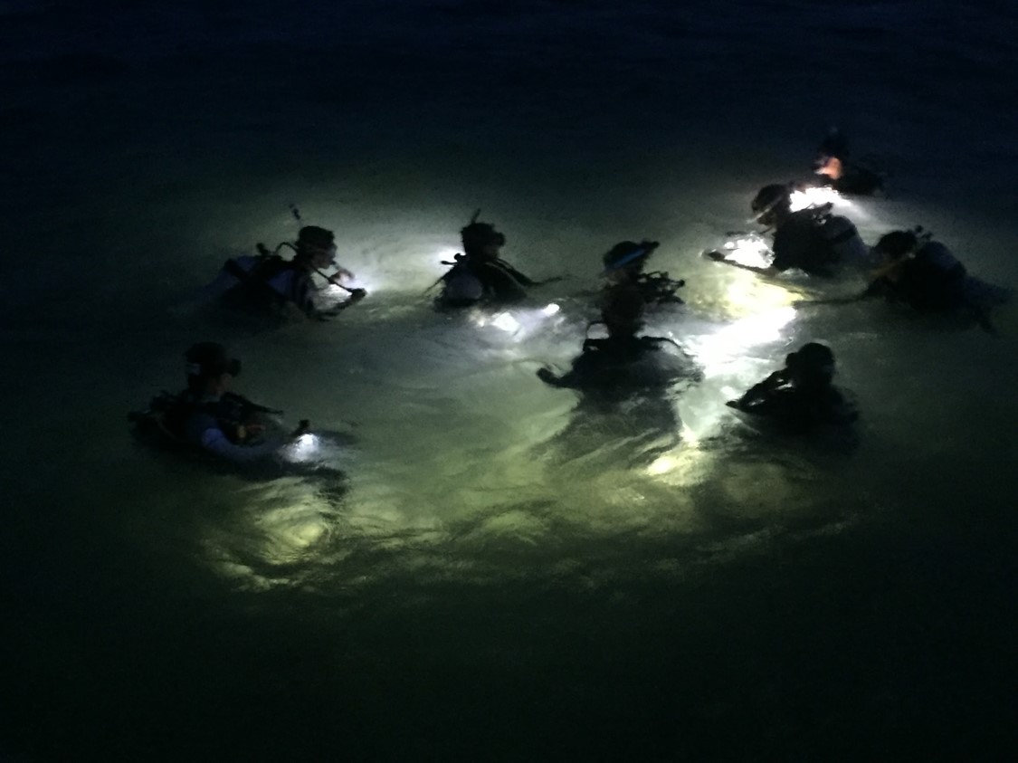 Before conducting any marine researches, we have to obtain certifications for diving first. This photo shows us performing a night dive for our Advanced Open Water certificate. The ocean at night is amazing as we saw bioluminescence, common octopuses, and also a spiny lobster!