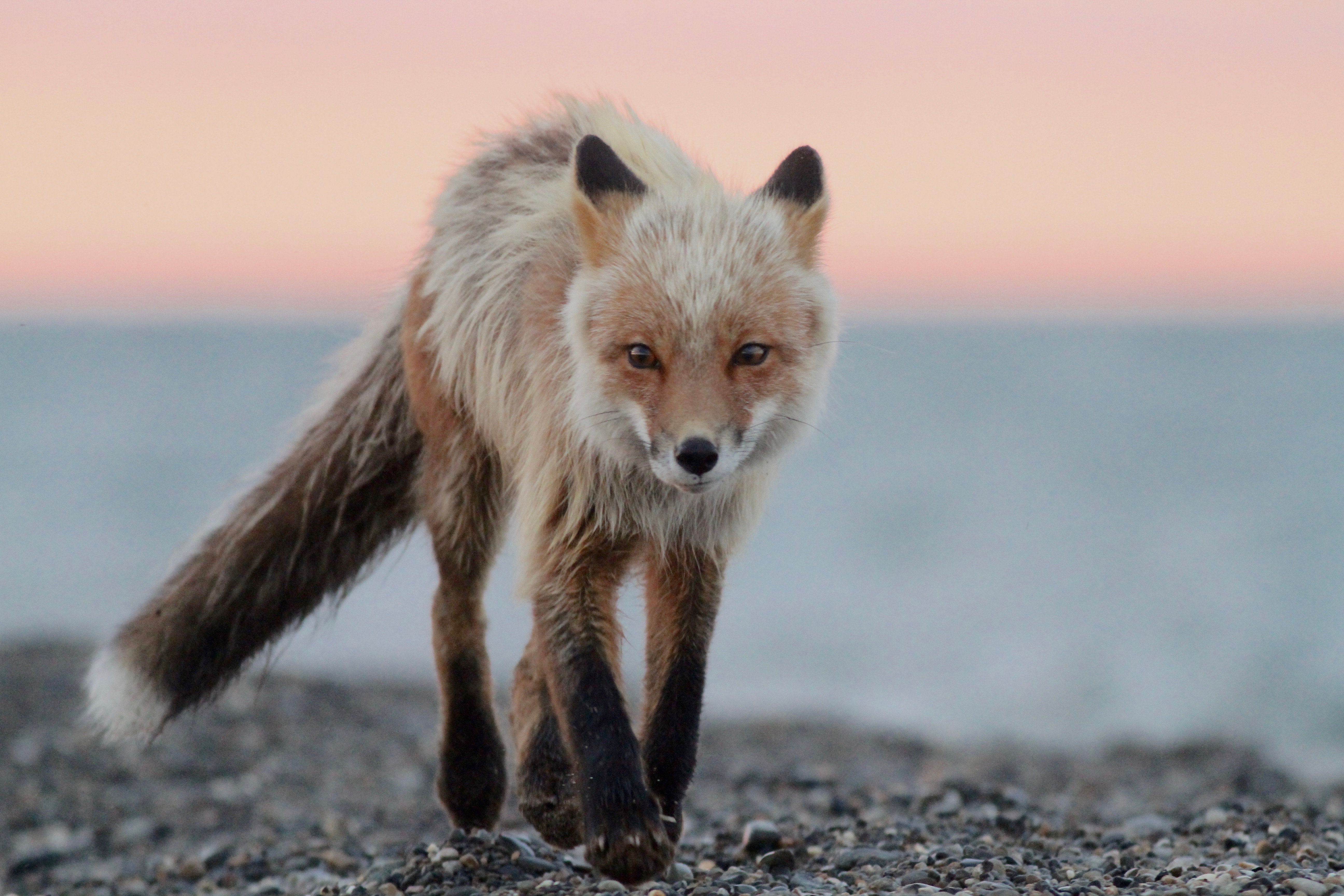 A red fox (Vulpes vulpes) walks along the beach near the Pauline Cove settlement on Qikiqtaruk-Herschel Island. Here, red foxes feed on lemmings and voles. Since 2018 is a peak year for rodent population numbers, we got to witness many successful hunts by this blonde-tinted fox, and fox prints on the beach in the mornings alluded to all the action happening at nighttime.