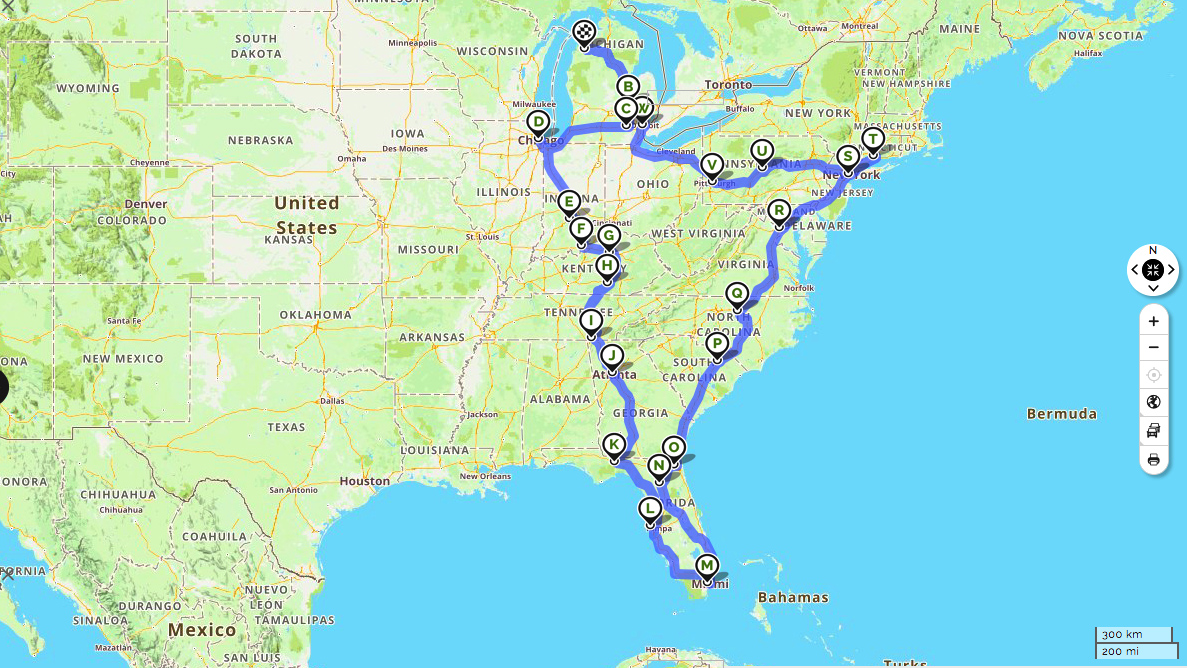 Traverse City MI, Flint MI, Chicago IL, Nashville IN, Louisville KY, Lexington KY, Burnside KY, Chattanooga TN, Atlanta GA, Tallahassee FL, St Petersburg FL, Miami FL, Gainesville FL, Jacksonville FL, Florence SC, Durham NC, Washington DC, New York NY, New Haven CT, Bellefonte PA, Pittsburgh PA, Detroit MI, Traverse City MI.