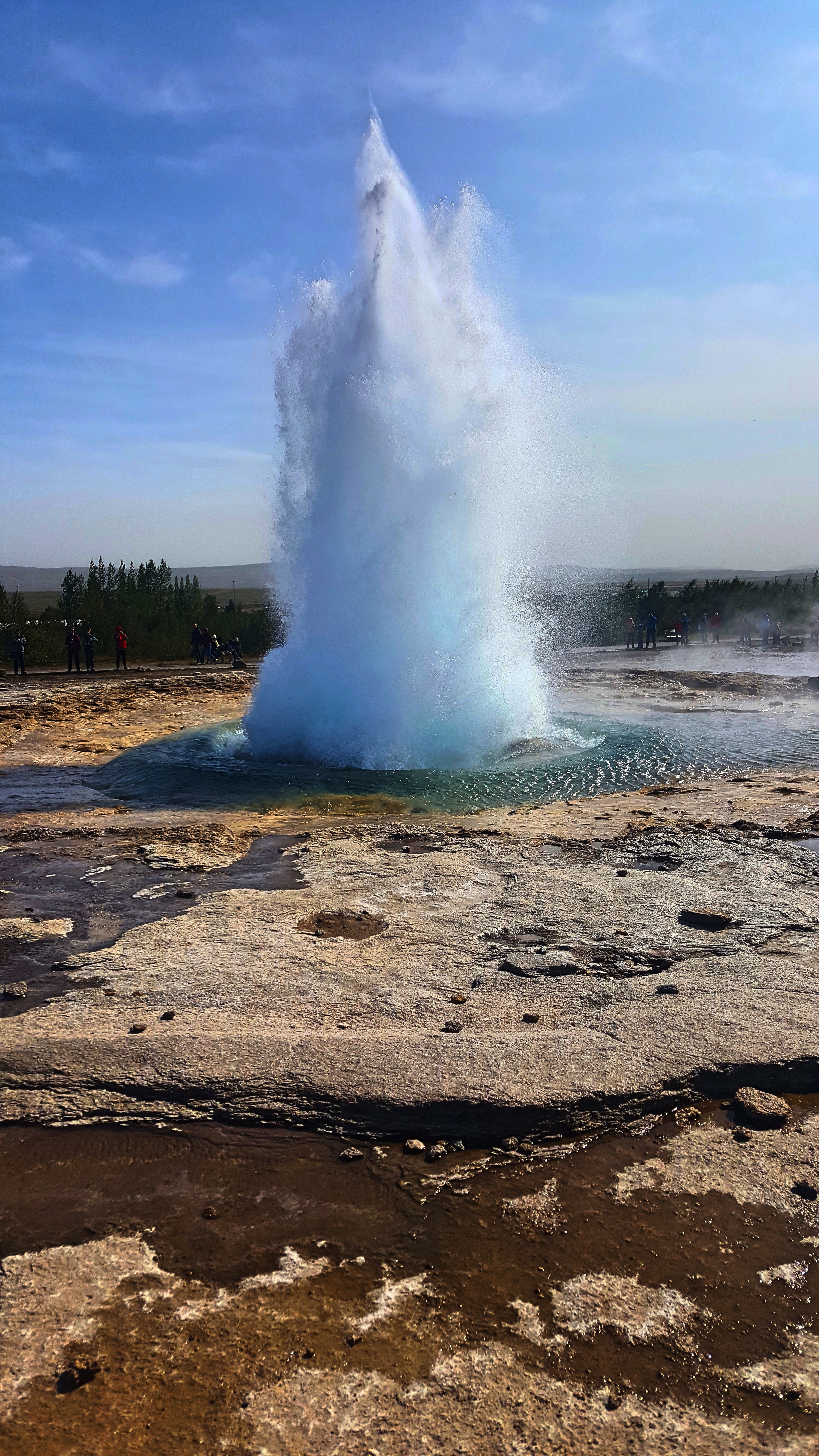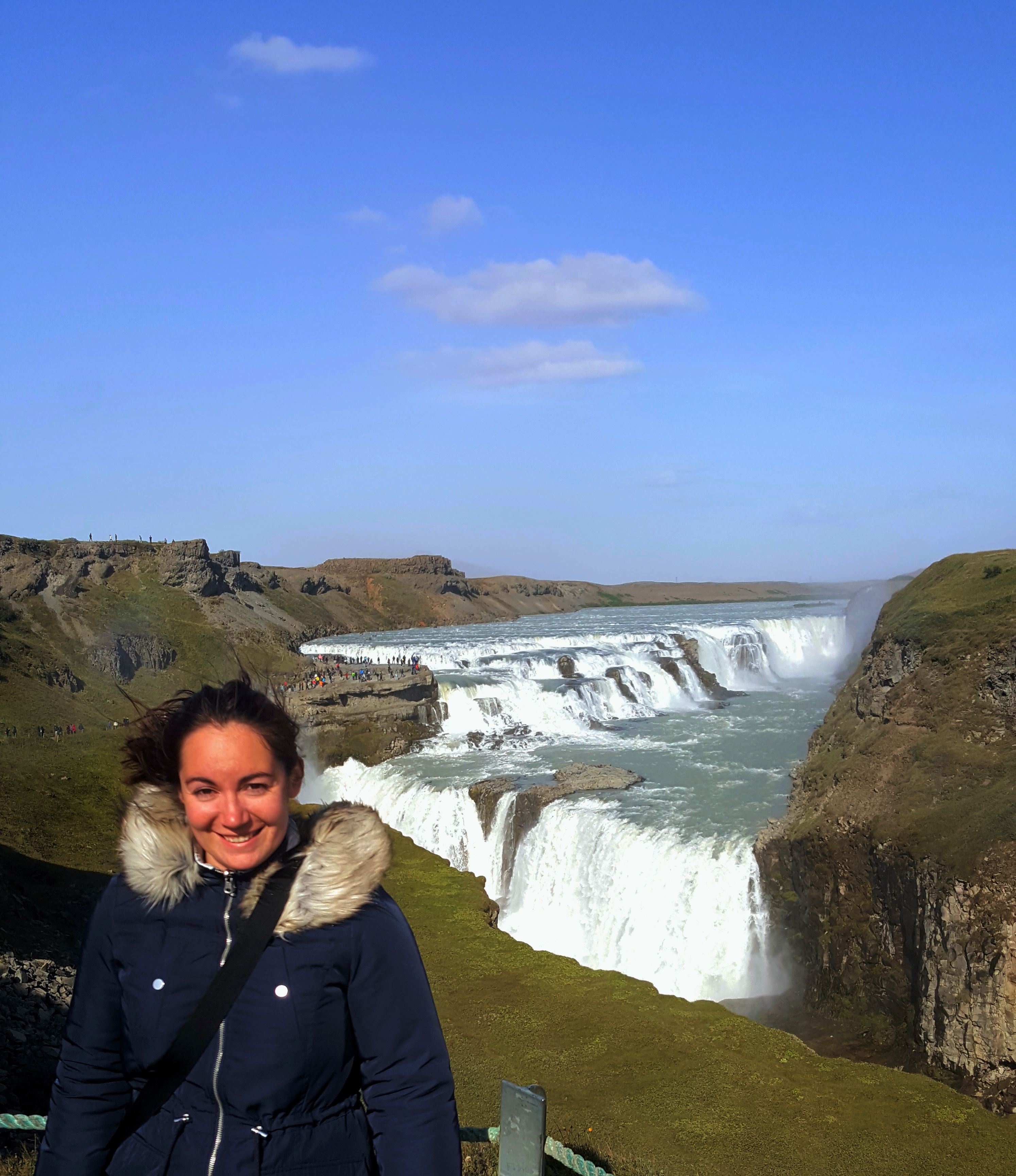 The explosive Geysir geothermal hot spring (left) and the very windy site of the Gullfoss waterfall (right), two of the main attractions in the Golden Circle.
